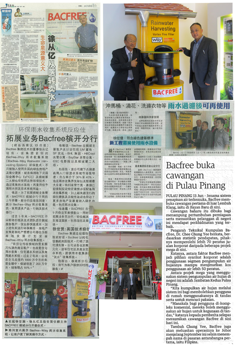 BACFREE a renowned brand for water filtration systems and an expert in water engineering solutions held a grand opening of its Penang branch. Media in Penang was invited to witness the opening and was also briefed of BACFREE’s Rainwater Harvesting System as well as its Grey Water Harvesting System. Post event interviews were also arrange with the spokesperson. BACFREE was featured in the cover story of The Star Metro Biz.